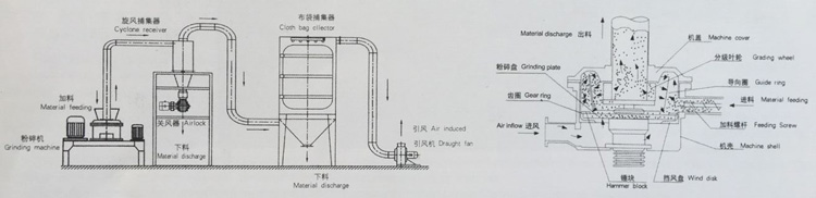 Materials enter the crushing chamber from the hopper through the screw conveyor and are sheared and crushed by the high-speed rotating blades. The materials are transported into the cyclone separator and bag filter by negative pressure air transportation, and dust can be recycled.